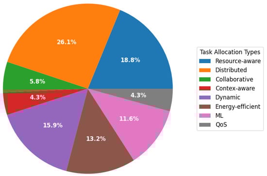 The task allocation methods (RQ1) covered by the papers we examined are shown in Figure 3. Most of the papers use distributed task allocation (26.1%), followed by resource-aware (18.8%) task allocation. Dynamic task allocation (15.9%), energy-efficient (13.2%), and machine learning (11.6%) task allocation followed next. Collaborative (5.8%), quality-of-service (4.3%), and context-aware (4.3%) task allocation are the methods that are mentioned less. It is also very important to note that, in many papers more than one task allocation methods was used and applied.
