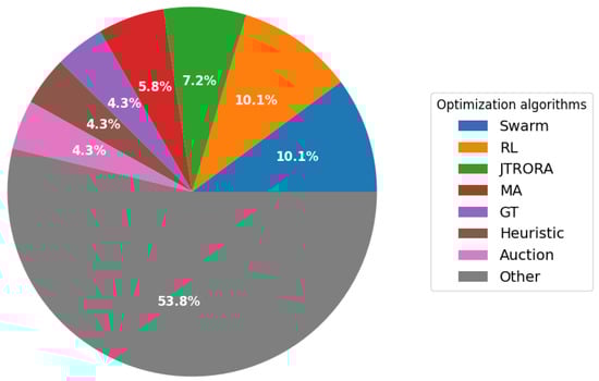 Regarding the task allocation optimization algorithms (RQ2), as shown in Figure 4, the most frequently used is the swarm optimization in various forms (10.1%), various methods of reinforcement learning (10.1%). JTORA (7.2%), multi-agent methods (5.8%), the game theory (4.3%), the heuristic approach (4.3%), and the auction algorithm (4.3%). We also identified the use of many other task allocation optimization algorithms that were unique; these cases refer to 53.8% of the sample examined. We should note again that many authors in their works implemented more than one optimization algorithm to illustrate the effectiveness of each optimization algorithm.