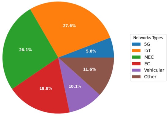 The communication network types (RQ3) are illustrated in Figure 5. Most papers applied IoT networks (27.6%), followed by mobile edge computing (MEC) networks (26.1%), EC networks (18.8%), vehicular networks (10.1%), and 5G networks (5.8%). The rest are illustrated as one category ’various kinds of networks’ (11.6%).