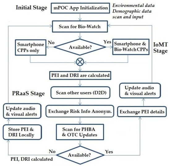 In this section, we will discuss the design of the innovative mPOC system and its algorithm, which is based on the Internet of Medical Things (IoMT) protocol. As previously mentioned, mPOC has been developed as an extension of an existing solution called the mHealth Disaster Recovery System (mDRS) [5]. The foundation of both, mPOC and mDRS revolves around the utilization of the Bio-Watch, which captures physiological signals from users in conjunction with a smartphone running the mPOC/mDRS apps—which are used in disaster management. The capabilities of the mPOC system have been expanded beyond the conventional mDRS to cater to COVID-19 applications, including the three stages of the mPOC algorithm, the DRI and PEI evaluations, as well as the intelligent warning system that was not included in the mDRS. In the following section, the details of the mPOC system are presented.