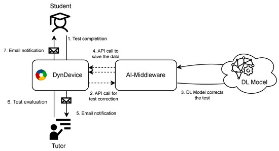 In addition to building the best possible model, another important step was to integrate the possible system within the enterprise software and in the human tutor workflow. In order to do so, we decided to leverage on a client-server architecture that exchanges information through an API call. This choice was mainly due to high fault tolerance, high parallelisation, and easy scalability. Multiple API calls can be executed, so multiple tests can be corrected, and if an API call crashes, the other calls are not affected. Furthermore, in the future, it will be easy to extend the middleware with new features or add new API calls or different deep learning models to correct the tests.