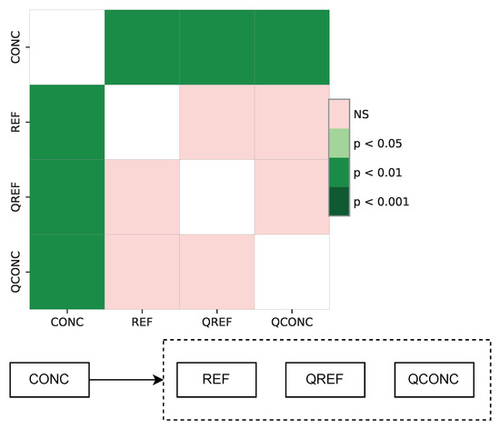Pairwise analysis of Friedman’s tests across the best models for CONC, QCONC, REF, and QREF configurations. The CONC model performs statistically differently from the REF, QREF, and QCONC models, with a p-value lower than 0.01. NS stands for no significant difference between the models in terms of performance. On the bottom, graphical representation of the Friedman test. The arrows show models with statistically different performance.