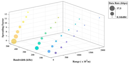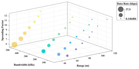 As an SX1276/77/78/79—137 MHz to 1020 MHz low power long range transceiver is considered for this study, the receiver sensitivity and the data rate for this transceiver for a particular combination of SF and BW is known. From this information, the path loss can be evaluated using the link budget in (3). An appropriate path-loss model can then be utilized to estimate the maximum communication range. For the three scenarios studied, free space, outdoor–urban and rural, and indoor, Figure 4, Figure 5, Figure 6, Figure 7 and Figure 8 depict the data rate and maximum communication range for every combination of SF and BW, respectively.