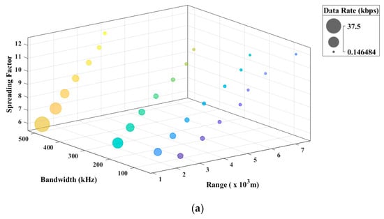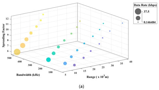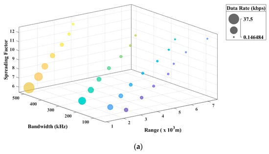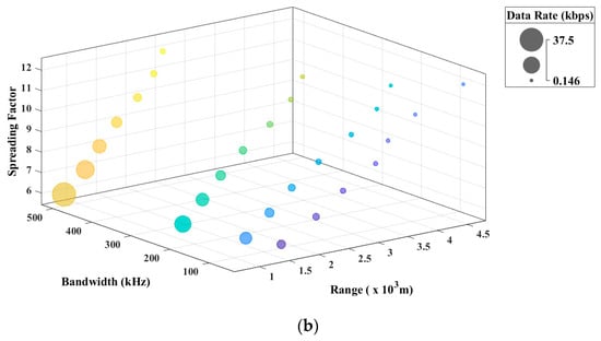 (a). Data rate and range characteristics for different SF and BW for outdoor urban—big cities scenario with the Okumura–Hata model. (b). Data rate and range characteristics for different SF and BW for outdoor urban—big cities scenario with LoRaT-PLM model.