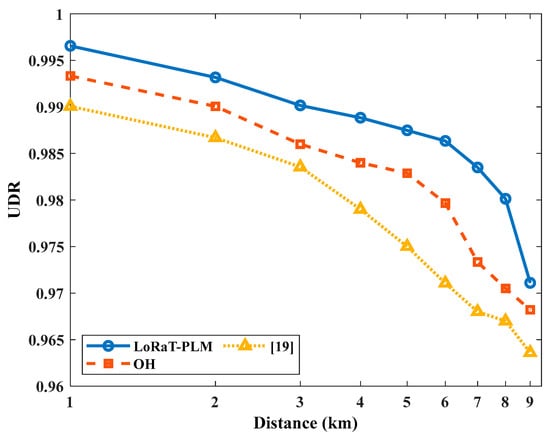 Comparison of the proposed LoRaT-PLM model with OH and model presented in [19] outdoor urban scenario—UDR as a function of distance.