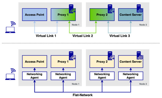 To further illustrate the issue that microservice platforms have for the implementation of NSes in cloud environments, Figure 1 showcases a logic implementation of a multimedia content delivery service, in particular, a simple content delivery network (CDN) service. This CDN has two HTTP proxies: the first one is utilised to cache the content sent from a multimedia server, which allows to make the content closer to the end users (reducing download times and bandwidth used in the network) while the second one is a firewall that filters undesired requests from a function outside the CDN. Ideally, a service of such characteristics must enable sending the requests from/to the corresponding proxies and servers involved in the CDN, following the schema depicted in the upper side of the figure. Furthermore, the HTTP proxy must be able to analyse incoming packets at the network layer to appropriately filter undesired requests. Implementing services like the one depicted in this example is often performed in cloud environments through virtual links (i.e., virtual networks) that enable the isolated communication of different modules, which can only reach the corresponding peers of a particular virtual network. This enables the creation of links between functions similar to the ones that are used in NSes in the context of NFV, enabling the connectivity of microservices in schemas like the one shown in the upper part of the figure.