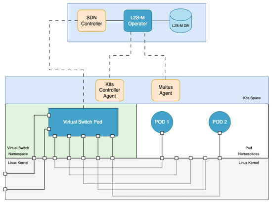 Figure 3 depicts the detailed implementation of the full L2S-M solution in a K8s cluster. This implementation contemplates the deployment of all the components depicted in Figure 2 with their respective particularities to allow functionality inside a K8s cluster since the implementation of this solution is not a straightforward task due to the complexity that pod namespace isolation and API model introduce in K8s.