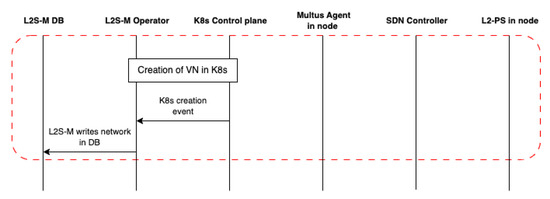 First of all, when a user wants to create a virtual network, as seen in Figure 4, the user will instruct K8s through its command-line interface (kubectl) to create the resource inside the cluster (i.e., a NAD with the definition of the virtual network). Once this creation is performed, the L2S-M operator picks up the K8s event and checks that this NAD definition corresponds to a virtual network. The way the L2S-M knows is that the NAD includes a virtual interface (i.e., an interface that is not physically defined in the host) called “l2sm-vNet”, informing L2S-M that the annotation is a virtual network. Once the event is picked up, the operator registers the creation inside its database, completing the creation of the virtual network.