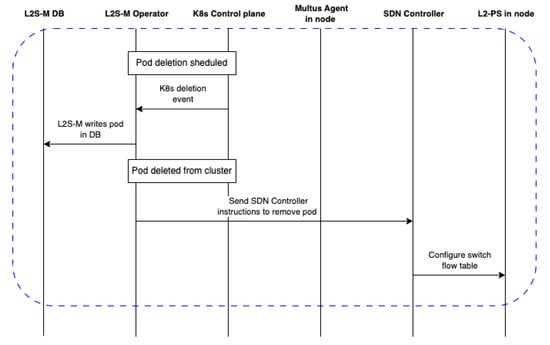 The procedure to delete a pod from a virtual network is very similar to the one for its deployment as seen in Figure 6: