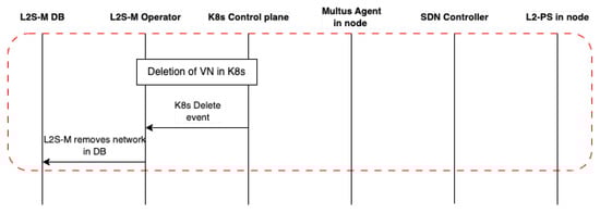 Finally, once a user wants to create a virtual network, as seen in Figure 7, the user will instruct K8s through kubectl to delete the resource inside the cluster. Similarly to the creation of networks, L2S-M picks up the K8s event and removes the virtual network entry from its database. This action will only be possible if all pods have been detached from the network; otherwise the operator will throw an error and prevent the deletion of the virtual network.