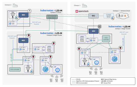 This paper also presented the use implementation of L2S-M in a complex Smart Campus scenario, deploying a CDN to distribute multimedia content in a complex, distributed and heterogeneous scenario. The tests performed in the validation of this paper showed that L2S-M is suitable to deploy complex NSes based in microservices that require the use of multiple isolated virtual networks for their proper functionality, interconnecting workloads located in different infrastructures over geographically distributed locations. Moreover, these tests depicted the flexibility of L2S-M to incorporate new infrastructures, like Wi-FI access points, to extend the functionality of the NSes in the use cases.
