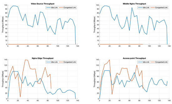 This behaviour can be further seen in Figure 11, where the traffic on each nginx element can be seen for two runs: one where the cache is disabled, and one where it is enabled (in both cases, the link was not congested). As it can be seen in all figures, traffic is present in all pods/VMs when the cache is disabled since the traffic is generated from the video-source VM in the main campus cloud and traverses the middle nginx pod. Since these entities must process this traffic, the overall throughput is lower, and the download takes significantly more time to finish. On the other hand, when the cache is enabled, the traffic is only generated from the edge nginx in Campus 2, which in turn requires less packet processing in the infrastructure (fewer nginx servers are involved), so the overall bandwidth is higher, and the download is significantly shorter.