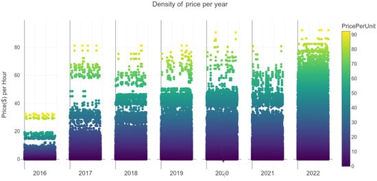 AWS data from 2016 onwards will be used to study the industry’s historical trends and to forecast future pricing. In 2022, Amazon was the major IaaS provider with more than half of the market share [5]. The pricing dataset (https://docs.aws.amazon.com/awsaccountbilling/latest/aboutv2/using-ppslong.html (accessed on 5 January 2023)), which spans over the last 7 years, is a useful resource for understanding broader market trends in IaaS and provide prediction models for market trends in the future.