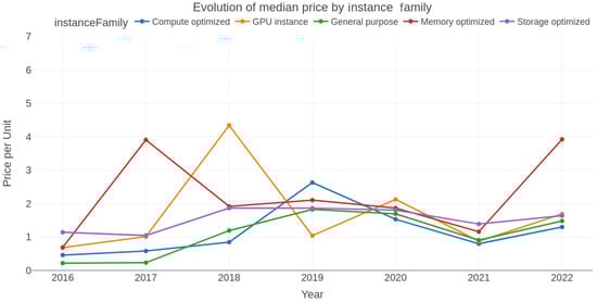 To gain further insight into the price evolution, we plot the yearly median offer price for each family in Figure 2. We have chosen the median rather than the mean price because mean values are significantly affected by extreme values and outliers. Median values are more resistant to such effects and are considered a more accurate measure for evaluating tendencies in general statistical data that can be asymmetrical and non-normally distributed [34]. The evolution of the median price value provides valuable insights into the dynamics of the cloud service market and its relationship to the larger global and social environment during that time period. With respect to Figure 1, we note that, in 2016, the prices for all families ranged from $0.21 to $1.14 per hour, the lowest being the general-purpose category and the highest being the storage-optimized category. This reflects the fact that, back in 2016, the market was still emerging with a limited range of specialized products. Following that, in 2017 and 2018, the median prices of some instance families fluctuated, and for memory-optimized instances, they increased by five times, reaching $3.9 per hour in 2017, indicating an increase in demand or a change in the market dynamics for memory-intensive applications. In 2018, GPU instances experienced a significant price increase to $4.30 per hour, indicating an increasing demand for specialized computational duties requiring high-performance graphics processing capabilities.