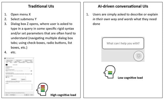 AI-driven, natural-language-based conversational (ChatGPT-like) user interfaces (UIs) are set to become the next big thing in the evolution of user experience design, much like the way mouse/point-and-click, speech and touch-based interfaces have revolutionized our interactions with computers and mobile devices [82]. Instead of asking users to adapt to and master rather rigid (pre-programmed) and less forgiving interfaces, UIs will more flexibly adapt to users’ needs more naturally. Users will simply be asked to describe in their way and words what they need done (Figure 1). GPT-OSM applies this concept to OpenStreetMap, allowing users to intuitively discover features on OpenStreetMap using natural language queries without the need to learn complex query languages or syntax [83]. Many healthcare UIs would benefit from the same approach, e.g., query UIs of electronic patient records and their aggregates and improved UIs for querying health digital twins (HDTs) [84]. In the case of HDTs, a ChatGPT-like UI can help bridge the gap between complex HDT data/models and their human users’ understanding and needs (users include healthy individuals, patients and clinicians).