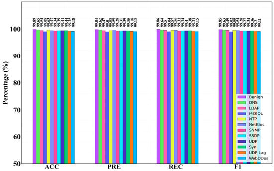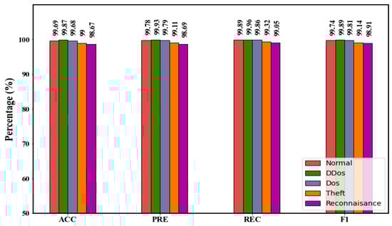 Table 2. From the figure, it is observed that the F1 (99.89%), recall (99.96%), precision (99.93%), and accuracy (99.87%) value of the DDoS class was higher than that for all other classes. Overall, the results were positive for all types of attacks. However, the reconnaissance class received the lowest grade because it resembled regular data. Moreover, theft-exfiltration also attained the least values because a few instances in the dataset were mistakenly classified as belonging to a different class.