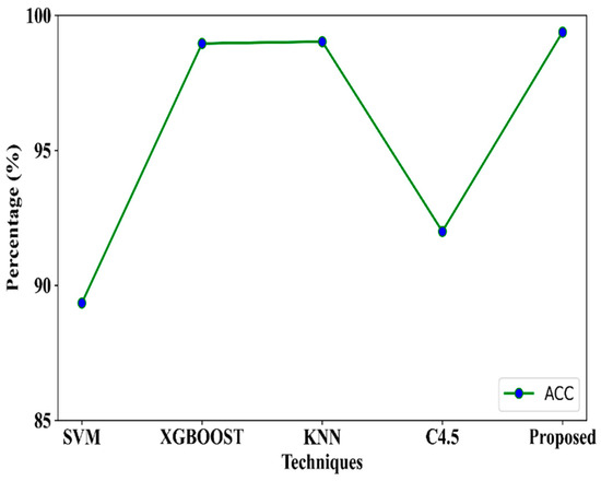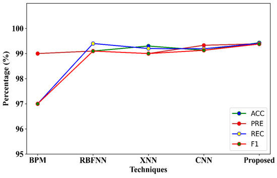 Figure 8. The existing techniques, such as radial basis function neural network (RBFNN), Bayes point machine (BPM), explainable neural network (XNN), and convolutional neural network (CNN) were used. From the table, it is observed that the proposed strategy attained 99.58% accuracy compared to all the other state-of-the-art methods on the UNSW_NB15 dataset; also, it is observed that the overall accuracy was improved with CNN more than other methods. This might be due to the fact that the correlation between target features is better learned by a convolution kernel than other shallow networks. However, in terms of precision, all the techniques achieved better results.