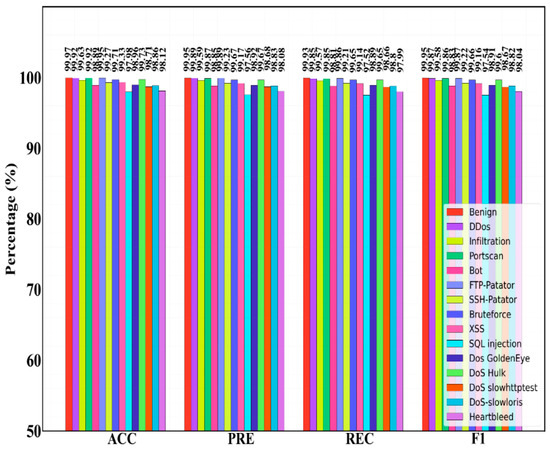 Regarding other performance scores, brute force and DDoS Hulk achieved similar PRE (99.67%), REC (99.65%), and F1 (99.67%) results. This demonstrated that the proposed classifier still displayed asymmetric behavior with regard to traffic classifications in this arrangement. Furthermore, ACC and REC rates are critical for assessing the classifier’s performance for every attack. According to the statistics, a class with low accuracy has a lot of false positives, which implies that ‘benign’ classes are unnecessarily marked as assaults.