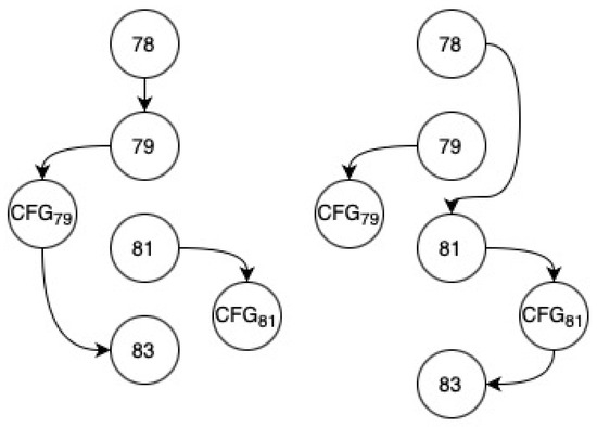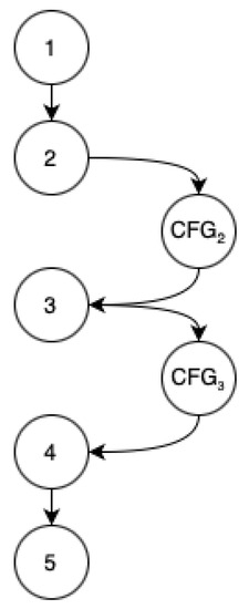 Listing 4 shows the source code for a method called start() and Figure 1 displays its CFG; the method is implemented in the LevelChangePropagator class from the lombok library (https://github.com/projectlombok/lombok, accessed on 17 April 2023). During the analysis, as this method contains two method calls, with their own CFGs, the CFG of start() was built with four nodes plus all the nodes of the CFGs for the called methods, named CFG96 and CFG98. Let us suppose that a single node is found to have more than one method call during the analysis; if so, then all the CFGs of the called methods will be connected following the order of execution.