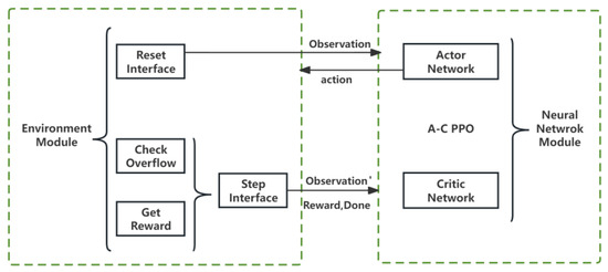 To evaluate the versatility of various reinforcement learning (RL) algorithms and to fine-tune hyperparameters for broader applicability, we decoupled the environmental module from the neural network. This separation enables the environmental module to focus exclusively on generating environmental feedback and computing rewards, a critical step in enhancing the scheme’s generality, as illustrated in Figure 3. The environmental module’s interfaces, namely reset and step, are integral to the RL process. The reset interface initializes or refreshes the environment to a baseline state, providing the initial observation post-training initiation or episode completion. In contrast, the step interface progresses the environment in response to the agent’s actions, delivering subsequent observations, instant rewards, termination flags, and additional context-specific data. This delineation of responsibilities ensures a coherent and systematic interaction between the PPO algorithms and the environment module, promoting an efficient learning cycle predicated on action-derived feedback.