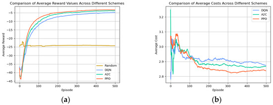 (a) Comparison of average reward values across different schemes; (b) comparison of average costs across different schemes.