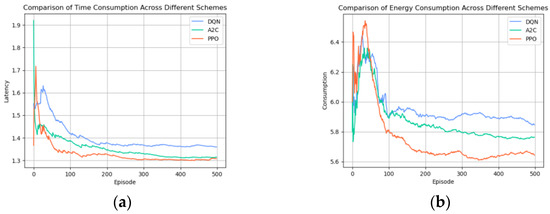 As shown in Figure 7a,b, the performance metrics of delay and energy consumption were compared among the different algorithms. The DQN algorithm demonstrated relative stability in both delay and energy consumption; however, its learning efficacy was marginally outpaced by the A2C and PPO algorithms. After 300 steps, the A2C algorithm’s performance in the delay reduction closely approximated that of the PPO algorithm, yet it lagged slightly behind in energy consumption efficiency. Overall, when evaluating the learning outcomes, the PPO algorithm emerged as the superior performer in comparison to the DQN and A2C models, particularly in terms of optimizing the trade-off between the delay and energy consumption.
