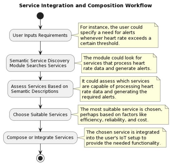 Figure 2 presents additional insights into the Service Integration and Composition process within SIM. Using an example, it presents a step-by-step workflow of how user requirements lead to the discovery, assessment, selection, and integration of services.