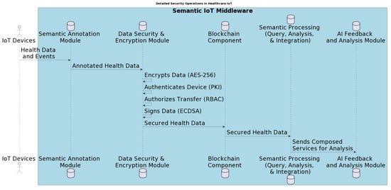 Healthcare data, by their highly personal and sensitive nature, necessitate top-tier security measures. The Semantic IoT Middleware (SIM), as shown in Figure 1, integrates a layered approach to safeguarding data integrity and privacy, especially when transiting through different components. Figure 4 further details the security capabilities of SIM, mainly the following: