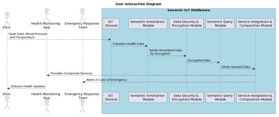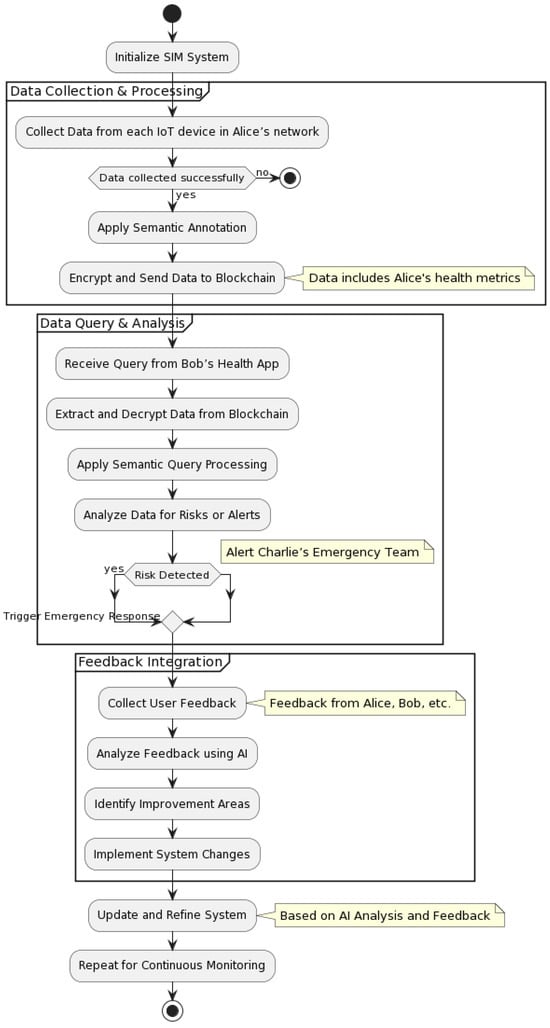 Lastly, the AI Feedback and Analysis Module captures user feedback and preferences to improve the system. Feedback from Alice about her health monitoring experience, Bob on the app’s performance, Charlie on emergency response efficiency, and Dave on data analysis is collected and used to refine the system’s operations. Figure 5 shows a diagram illustrating how Alice’s data are collected and processed by different modules of SIM to deliver services or trigger alerts.