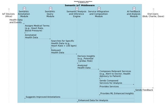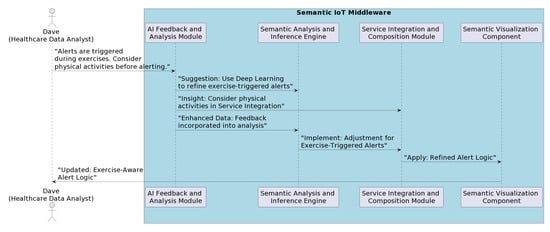 Figure 7 provides a detailed view of the operations within each module of the middleware. It highlights the role of the AI Feedback and Analysis Module in refining system performance and demonstrates the sophisticated process that transforms Alice’s raw data into actionable insights and services.