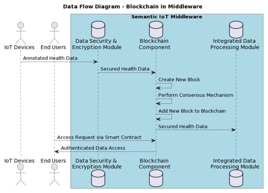 Upon structuring and annotating Alice’s data, the Data Security and Encryption Module encrypts the information, ensuring its secure transfer to the Blockchain Component. The data are securely stored and safeguarded against unauthorised access and modification. When Bob’s health monitoring app needs to access Alice’s data, it queries the Semantic Query Module. This module utilises a semantic query language to search through the blockchain-stored annotations and retrieve relevant data. For example, it could search for instances where Alice’s annotated heart rate data are labelled as “Elevated”.
