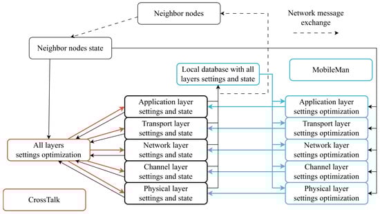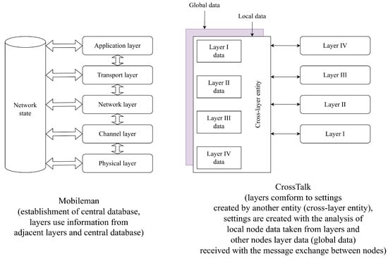 There are two main architectures for cross-layer methods (Figure 4): “MobileMan” [] and “CrossTalk” [].