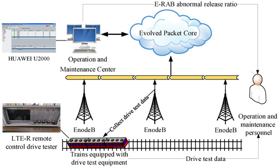In this study, we chose relevant data for the operation and maintenance of the Shuo Huang Railway LTE-R network to construct a dataset for detecting cells with degraded communication performance. There are two main sources of Shuo Huang Railway operation and maintenance data: drive test data and abnormal release data from the E-RAB for each wireless communication service exported from the LTE-R Operation and Maintenance Center (OMC). Drive tests are the most commonly used methods for measuring the wireless network communication status along the Shuo Huang Railway. They are usually carried out by operation and maintenance personnel, who use measurement equipment to collect wireless communication performance indicator data from the user equipment (UE) side along the Shuo Huang Railway. At present, the OMC used in the Shuo Huang Railway LTE-R system is the Huawei u2000 (Huawei, Shenzhen, China),which can record historical key performance indicator data from the LTE-R system, thereby achieving unified management and maintenance of the network element layer and the network layer of the LTE-R network [32]. Figure 1 shows the source of Shuo Huang Railway operation and maintenance data.