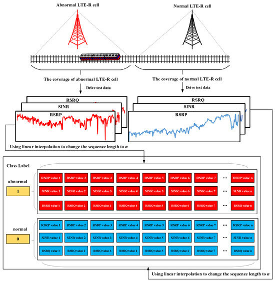In this paper, the drive test data of each LTE-R cell are taken as feature values and the linear interpolation method is used to interpolate the drive test data into sequences of the same length. Then, based on the EARR of the communication services with a QCI of 1 exported by the OMC, the drive test data are labeled as abnormal or normal, and a dataset is constructed for the detection of LTE-R cells with degraded communication performance. Figure 2 shows the construction process for this dataset.