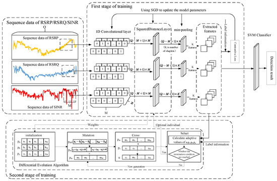 From Figure 3, it can be seen that for the one-dimensional sequence dataset composed of the measured values of each key performance indicator from the drive test data, the input one-dimensional sequence data are first passed through a one-dimensional convolutional layer to obtain every subsequence of the input sequence data. Afterward, these subsequences are input into a squared distance layer, in which the weights of the neural network layer represent the shapelets of the input sequence data. Therefore, the role of this layer is equivalent to calculating the distance between each shapelet and each subsequence of the input sequence. After passing through the distance calculation layer, the distance between each shapelet and each subsequence passes through a min pooling layer and the output is the distance between each shapelet and the input sequence data, which is the result of shapelet transformation. As mentioned in Section 3.1, we selected three key performance indicators from the drive test data to use as input data: RSRP, RSRQ, and SINR. In order to perform the shapelet transformation of these three indicator sequences simultaneously, the shapelet transformation results of each indicator sequence are merged in the output layer to form a unified model. In order to obtain shapelets that can maximally distinguish different class sequences, we propose a two-stage training method to train the model. In the first stage, the contrastive loss [34] is used as the loss function to train the feature extraction network. In the second stage, the differential evolution algorithm is introduced to optimize the weights of the squared distance layer while setting an optimization objective based on the Fisher criterion. The entire model training process can also be regarded as the process of finding the optimal shapelets for each sequence. At this point, feature extraction for the imbalanced multidimensional sequence dataset is complete. Finally, following feature extraction, the dataset is input into an SVM for classification, thereby achieving the detection of LTE-R cells with degraded communication performance.