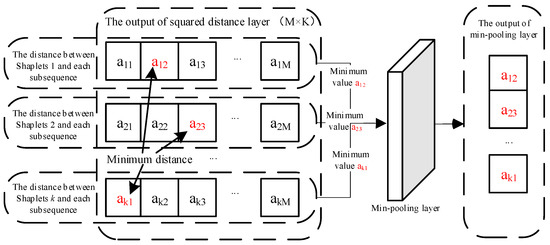 Step 3: Calculate the minimum distance between each shapelet and each subsequence. According to Section 3.2, to obtain the distance between each shapelet and the input data, it is necessary to calculate the minimum distance between each shapelet and each subsequence. The above goals can easily be achieved via the min pooling layer. Figure 4 illustrates the working principles of min pooling.