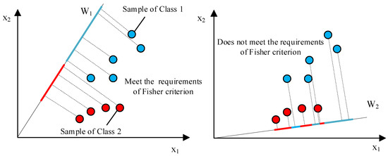 The Fisher criterion was proposed by R. A. Fisher in 1936 [36]. The basic idea of the Fisher criterion is to find a certain projection subspace in a feature space so that all feature points can have the best classification performance in that subspace. The basic principle of the Fisher criterion is shown in Figure 5.
