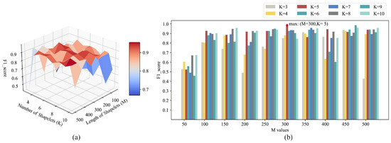 It can be seen from Figure 7 that when M equals 300 and K equals 5, we can obtain the maximum F1 score value. Therefore, in this experiment, we set the length of the shapelets M to 300 and the number of shapelets to 5.