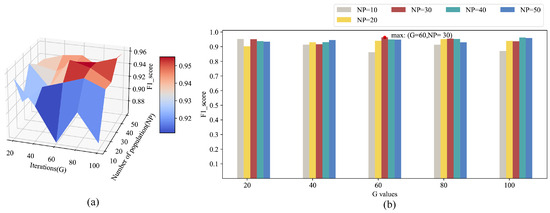 As can be seen from Figure 8, when equals 30 and G equals 60, we can obtain the maximum F1 score. Therefore, in this experiment, we set the population to 30 and the maximum iteration to 60.