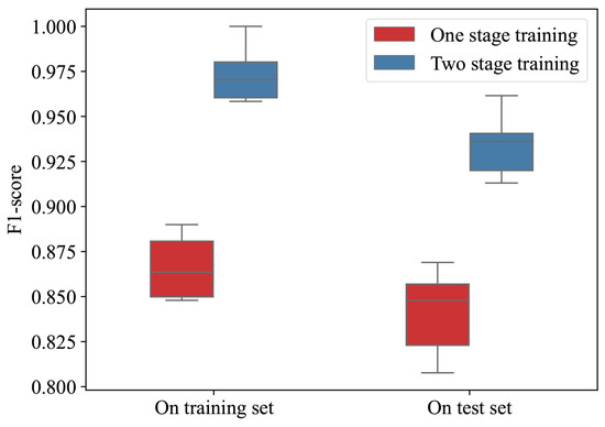 Before conducting the comparative experiments, we first verified the effectiveness of the proposed two-stage training method on the experimental dataset. Figure 9 illustrates the classification performance of the model after training it 10 times on the training and test sets, both with and without using the two-stage training method.