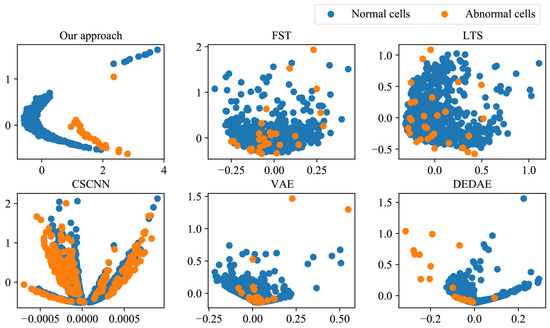 Figure 10 illustrates the feature data after PCA dimensionality reduction. It can be seen that the features extracted by the proposed feature extraction neural network were able to distinguish between normal and abnormal cells at the feature level. This is because the proposed optimization objective, based on the Fisher criterion, can minimize the within-class scatter of extracted features while maximizing the between-class scatter. The features extracted by the other five comparison approaches could not clearly distinguish between the two types of samples at the feature level, which affected the accuracy of classification. The experiments showed that the proposed approach has obvious advantages over the comparison approaches when extracting imbalanced sequence features.