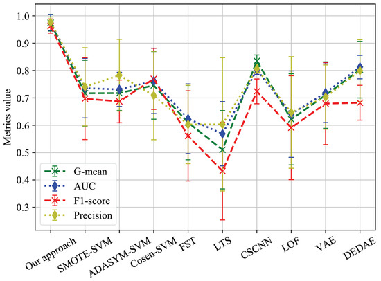 As can be seen from Figure 10 and Figure 11, our approach was significantly superior to all other comparison approaches in terms of G-mean, AUC, F1 score, and precision. CSCNN also achieved good results, which can be attributed to its use of cost-sensitive loss functions and the strong feature extraction ability of convolutional networks for sequence data. However, CSCNN still had a significant disadvantage compared to our approach due to the difficulty in determining cost-sensitive factors. The imbalanced data classification methods and anomaly detection methods also showed relatively good performance. However, as can be seen from Figure 11, these methods were significantly less stable than our approach. FST and LTS performed the worst due to the insufficient information provided by the minority class samples, resulting in model bias.