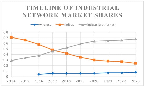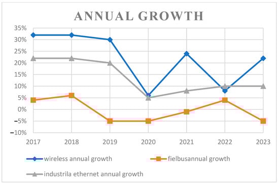 Wired communication technologies have played a significant role in industrial monitoring and control networks and have a significant development lead regarding wireless networks. Useful data for understanding the gap between the two technologies can be obtained from the annual research published by HMS Networks [22,23]. HMS Networks conducts an annual assessment of the industrial network market to estimate the distribution of new nodes within factories. In Figure 2, the timeline of the industrial network market shares is shown. Both technologies at the top of the timeline—Fieldbus and Industrial Ethernet—are wired technologies; wireless networks have the lowest percentage of uses for the industrial environment. To better study the long-term development of these networks, it is useful to consider the annual growth of each technology, as depicted in Figure 3. The yearly expansion of wireless networks is consistently making significant strides. According to research conducted by HMS Networks, industrial wireless networks have experienced a remarkable 22% growth in the past year, and their market share reached 8% in 2023, marking a 1% increase from 2022. This acceleration can be attributed to the increasing introduction of wireless solutions in industrial automation, with common applications including replacing cables, enabling wireless machine access, and facilitating connectivity with mobile industrial equipment.