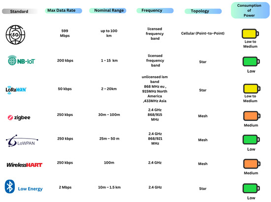 Figure 4 illustrates the distinct characteristics of each wireless communication protocol, making it clear why a specific WSN must be developed to meet the unique needs of different infrastructures. No single protocol effectively covers all scenarios. For instance, 5G offers high data rates but incurs higher costs due to frequency band commitments. LoRa, while cost-effective and capable of long-range coverage, is limited by its use only in industrial, scientific, and medical bands (ISM bands), with a lower data rate of 50 kbps impacting its versatility. Similarly, ZigBee boasts a higher data rate but cannot cover extensive distances and has a higher power consumption. This interplay of advantages and disadvantages across all protocols underscores the importance of precise study and design for the optimal configuration of a WSN.