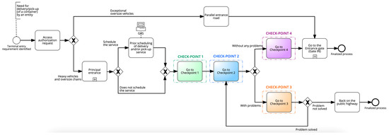 Figure 2 illustrates the different locations where the AS-IS process for entering and leaving the terminal is carried out: documentation room (container and lorry access control point), security area (people access control point), entry and exit gates (and their respective barrier and gateway), and road access to the gates.
