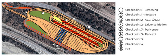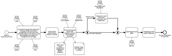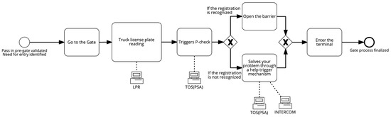 - Automated identification: This is performed using technologies such as RFID (radio-frequency identification) and NFC (near-field communication). Vehicles, containers, and drivers can have tags or cards equipped with these technologies, allowing for quick, contactless identification when passing through the gate. This helps to control entry and exit operations at the gate and to make the gate itself more available [12,21,22].