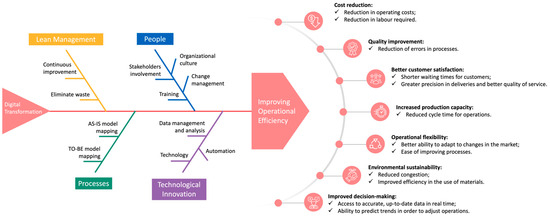 From a cause–effect analysis and considering the contributions of the different areas involved in this study in the search for operational efficiency or simply the elimination of waste in a seaport road terminal, Figure 9 systematizes the main areas of intervention, from the purpose to the solution. Areas such as lean management, processes, people, and technological innovation feature prominently as important contributions to the solution. Thus, each of the branches in Figure 9, represented by an Ishikawa diagram, shows a cause coming from an area: in lean management, the emphasis is on continuous improvement and eliminating/mitigating waste; in processes, BPMN is highlighted as a vital tool for mapping, managing and understanding processes, helping to anticipate results and mitigate risks; in technological innovation, technology and automation stand out, making it possible to manage and analyze data used to drive strategic decisions based on information updated in real-time; in the area of people, their involvement and collaboration, their training and qualification, and the promotion of a strong organizational culture are considered crucial to achieving operational efficiency. The benefits expected from these aspects are listed on the right-hand side of Figure 9. Therefore, these aspects position the organization to face future challenges and maintain its competitive edge in the market.