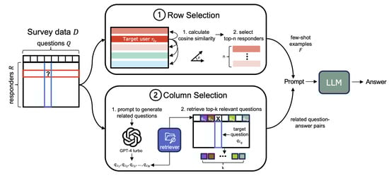 An overall illustration of our method. Our method consists of two main steps for predicting item non-responses in survey data using an LLM: (1) Row Selection: This step involves identifying similar respondents to the target user based on their responses. Cosine similarity is calculated between the target user and other respondents. The most similar respondents are selected as few-shot examples to be included in the prompt. (2) Column Selection: In this step, the GPT-4 turbo generates a set of relevant questions related to the target question. These questions are then used to retrieve corresponding question–answer pairs from the dataset. The most relevant pairs are included in the prompt provided to the LLM. Finally, the prompt, containing both selected respondents’ examples and relevant question–answer pairs, is then fed into the LLM to predict the missing answer for the target user.