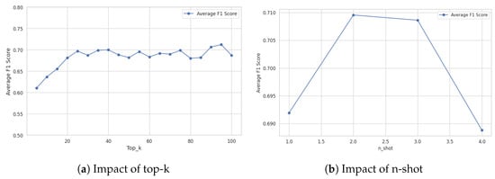 The impact of top-k responses and n-shot respondents on the model’s performance, as measured by F1-Score. (a) The average F1-Score trend across different top-k values (ranging from 5 to 100) shows that performance generally increases until top-k reaches 25, after which the scores plateau with minimal improvements. (b) The average F1-Score trend across different n-shot values (ranging from 1 to 4) indicates that the highest performance is achieved at 2-shot, with scores slightly declining as n-shot increases beyond this point.