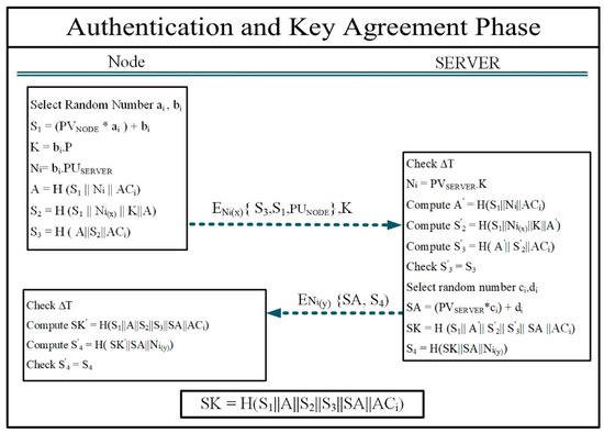 The authentication and key-exchange phase comprises three steps, wherein the communicating parties authenticate each other using various parameters within the proposed protocol. During this phase, specifically in the three-stage process of authentication and key agreement, a mechanism is employed. In this mechanism, the node and the server use a dynamic symmetric encryption key to secure the exchanged data. Additionally, throughout this phase, mutual authentication takes place with distinct parameters. Finally, in the last step, the communicating parties generate a secure session key based on private and verified parameters. The node acts as the starting point for communication with the server.